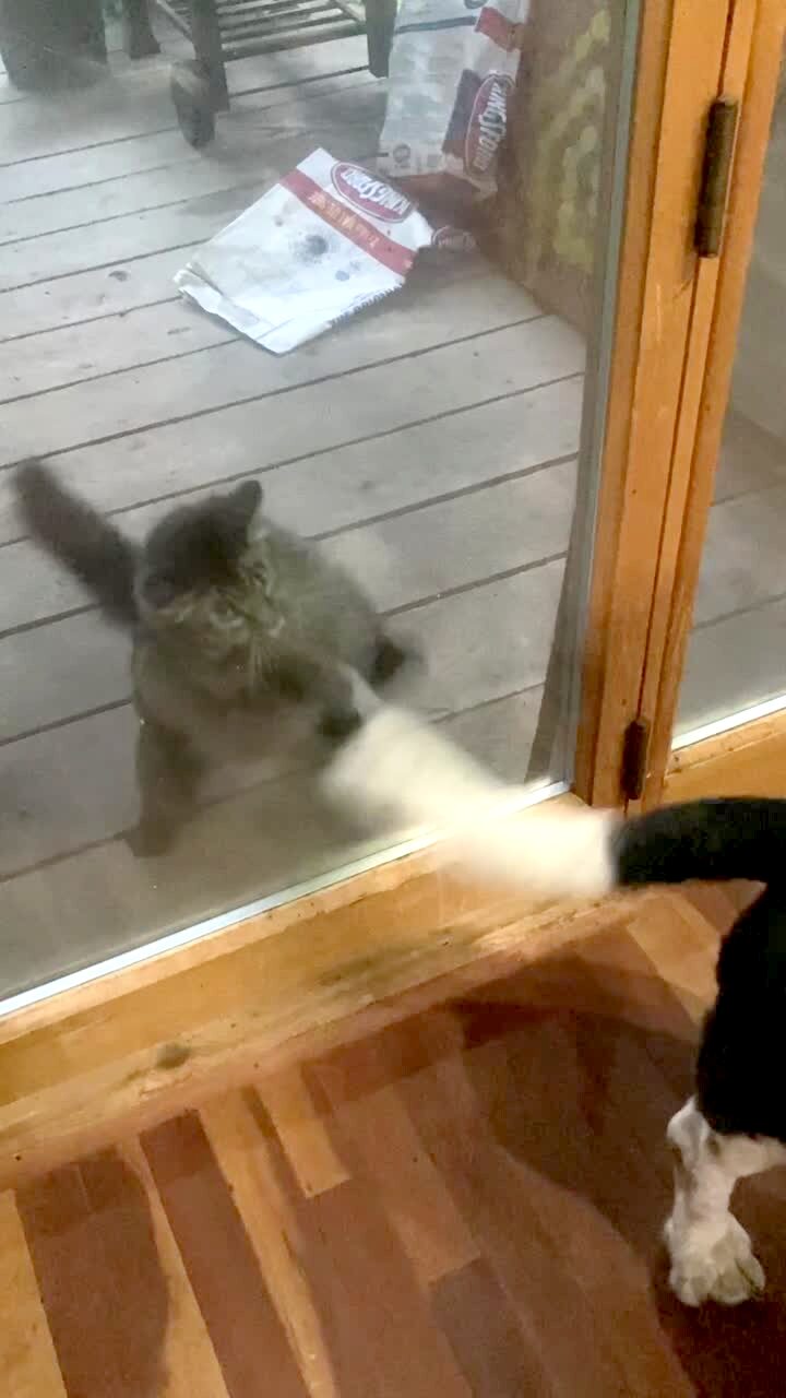 A cat outside on a deck watches a dog wag his tail through a glass door. The cat hits the glass repeatedly while he tries to swat the dog's tail.