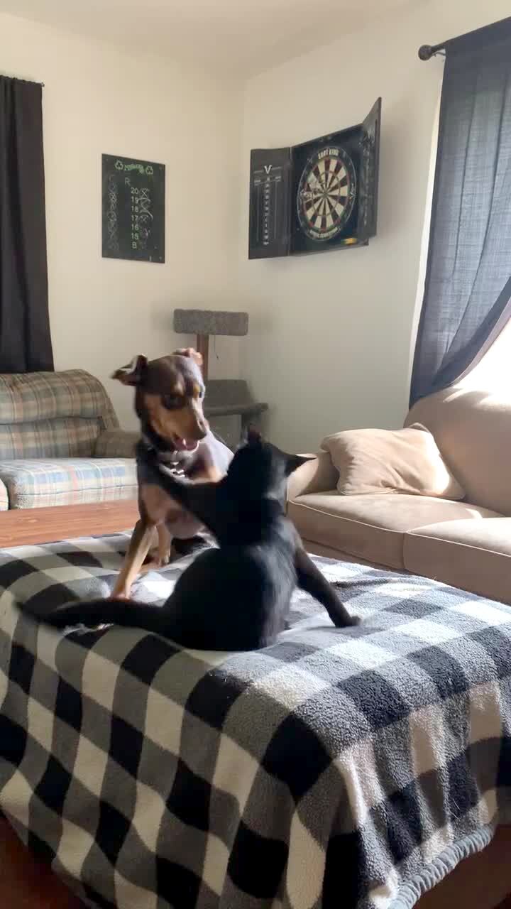 A cat and a dog play fight on an ottoman, and the dog pushes the cat off.
