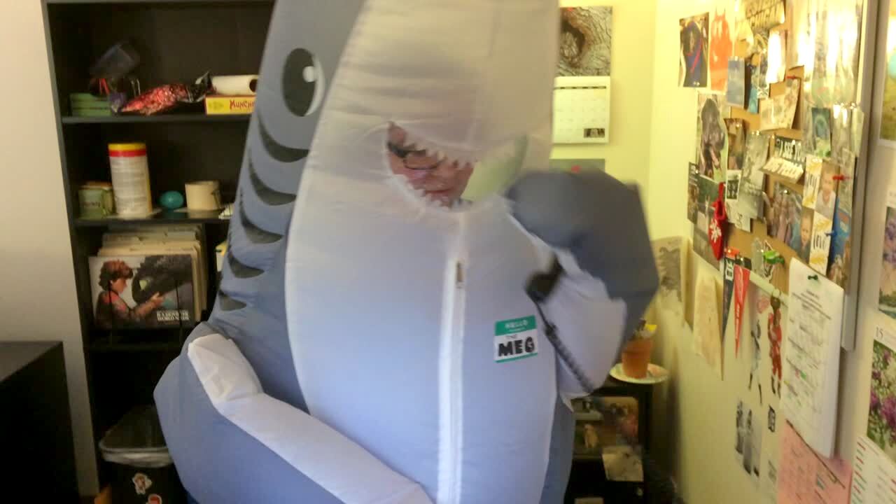 A woman wears an inflatable shark costume in an office and answers a phone call and asks if anyone lost a phone.