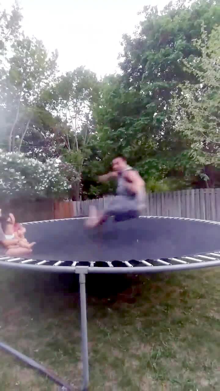 A man does a back flip on a trampoline, then bounces and flies off of the trampoline in a backyard.