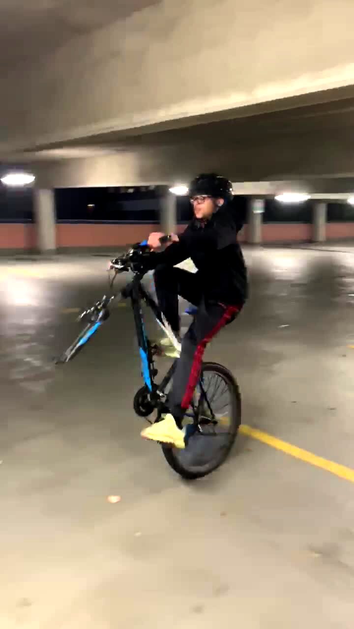 A teen boy pops a wheelie on a bicycle, but the front wheel falls off and he crashes.