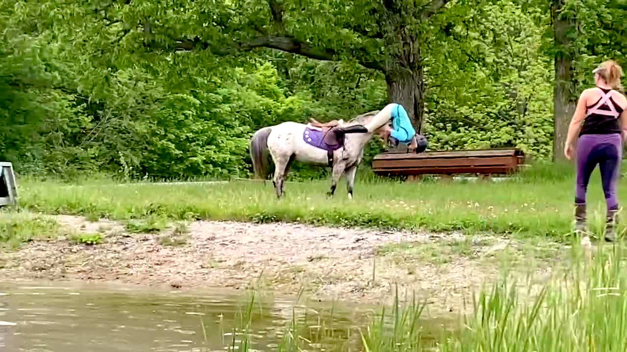 A woman gets bucked off of a horse but she falls onto its head and lays over it before she falls off.