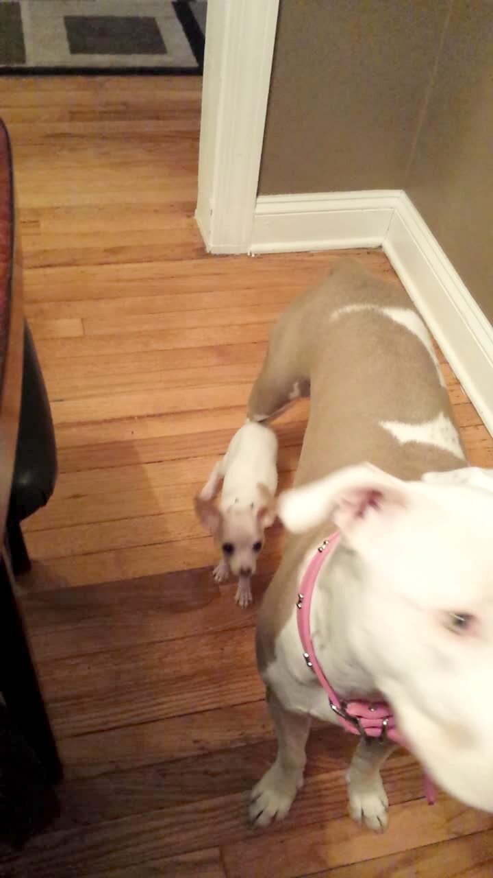 Bigger dog pulls smaller dog around by tail. MOVE IT ON OVER