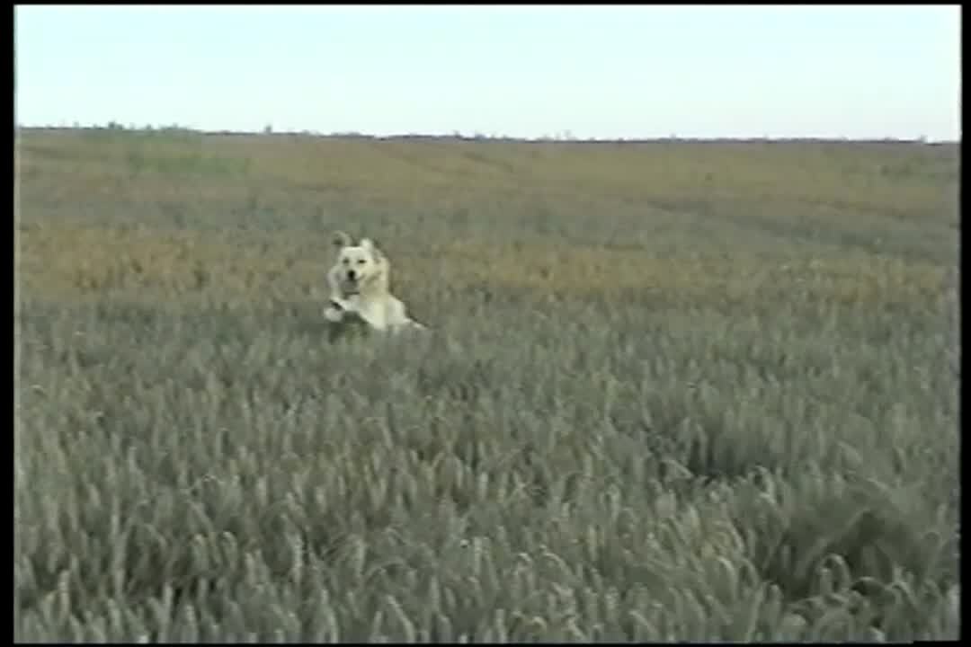 Two dogs leap / jump through hay field, pop their heads up. Grass is very tall, can't see the dogs until they jump. Silly pet trick.