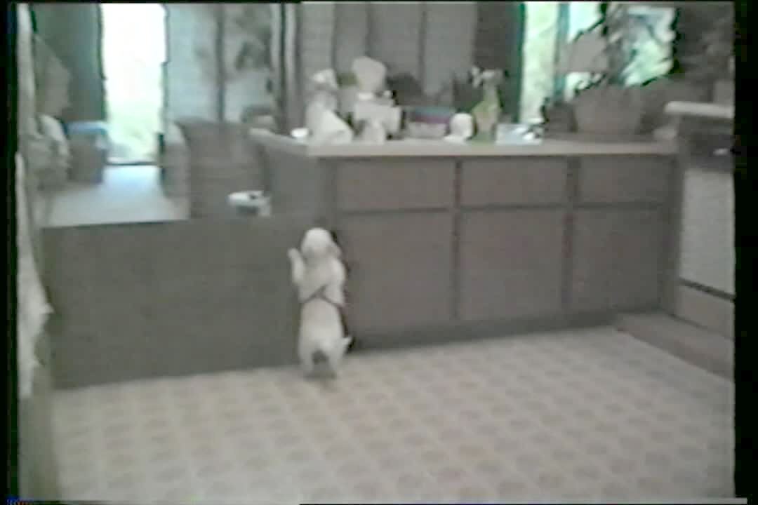 "Footstool Fetching Fido" Little white dog pulls stool over to jump over baby gate. escape