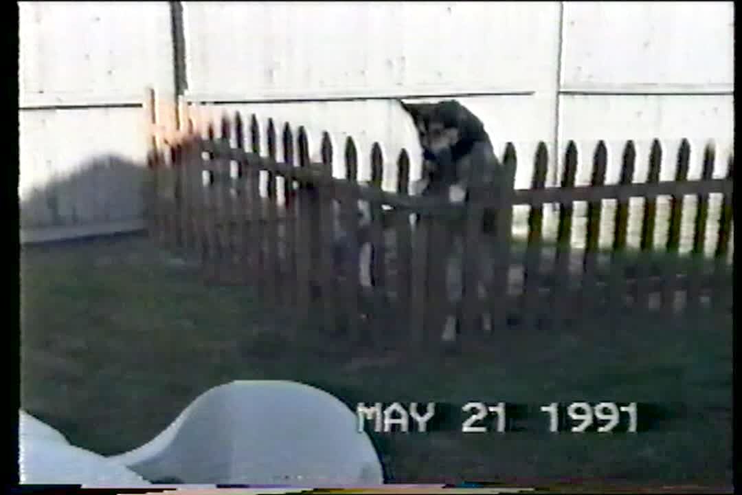 "The Great Escape" 2 Chihuahua dogs sit behind a doggy gate. 1 squeezes through the fence and pulls the gate down. He is stuck in between the bars and flails around.