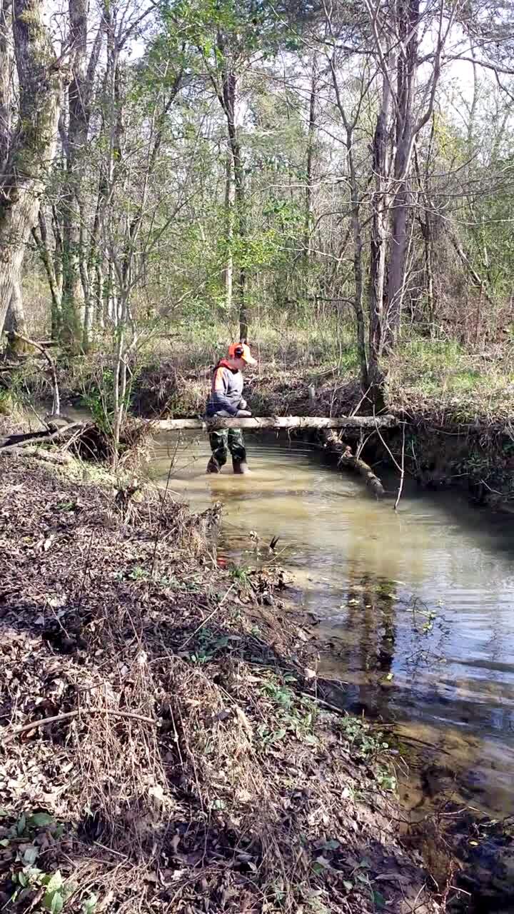 A teen boy stands on a tree stump next to a stream in the woods and uses a large stick to vault himself over the water. The stick breaks and he falls in the water.