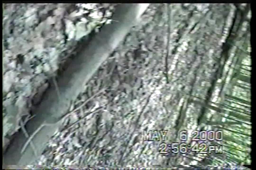 Large teen boy pulls & breaks off a small tree & it hits him in the head, he falls down. Bonehead. Forest, woods.