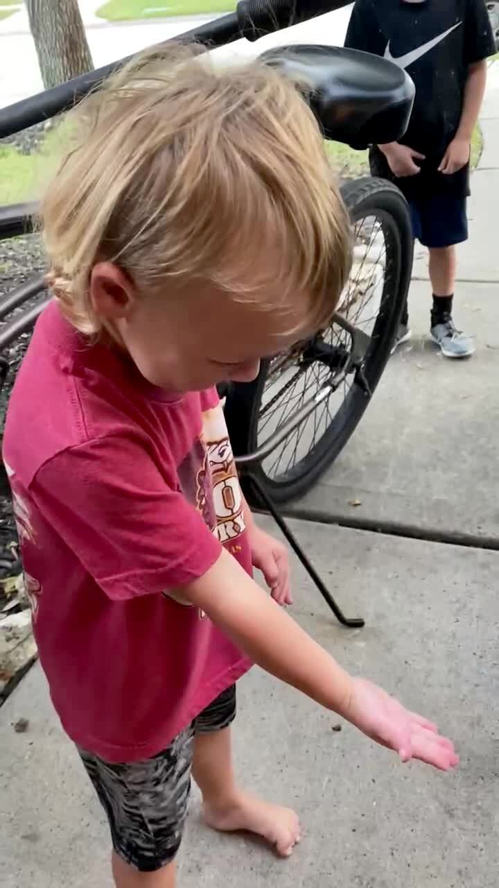 A Boston Terrier and a small boy chase bubbles being blown by a man. The dog jumps to catch a bubble and accidentally tackles the boy.