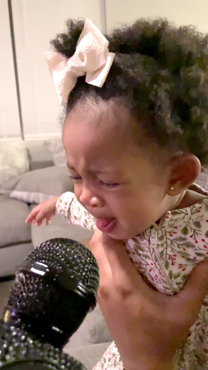 A baby girl coos and babbles while she plays with a phone. She crawls over to her father and hits the man in the groin.