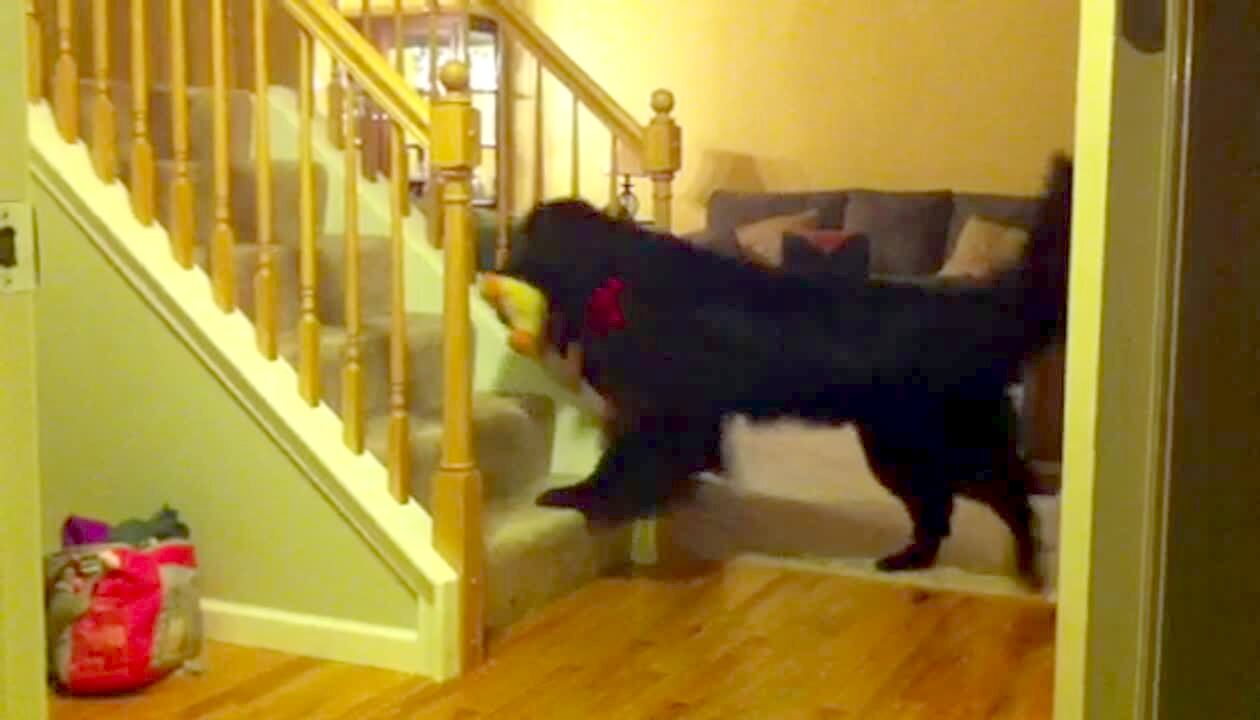 After his kids go, a man slides down the stairs on an inflatable mattress but he flips over and falls to the bottom of the stairs