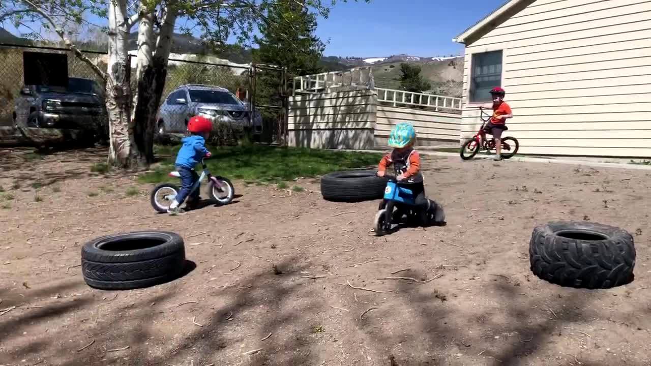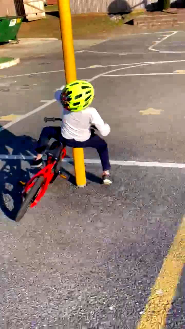 A young boy says, "I can do it now," as he rides his bicycle straight into a pole.