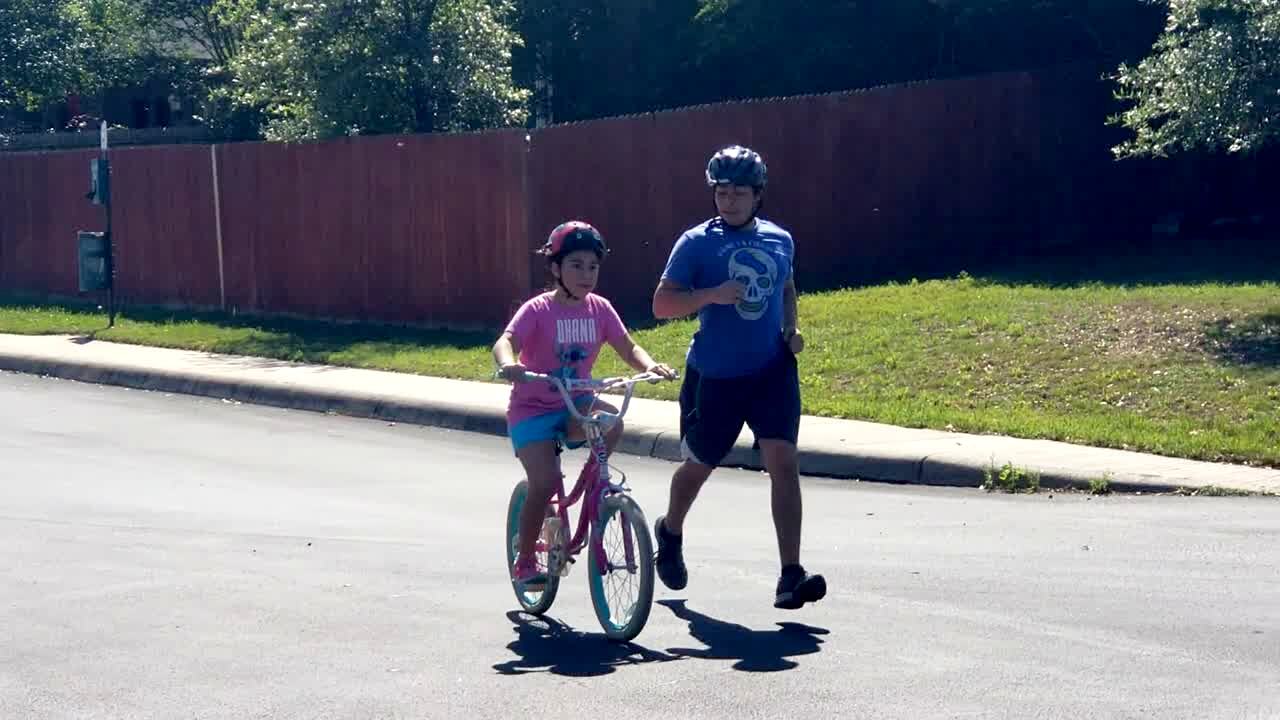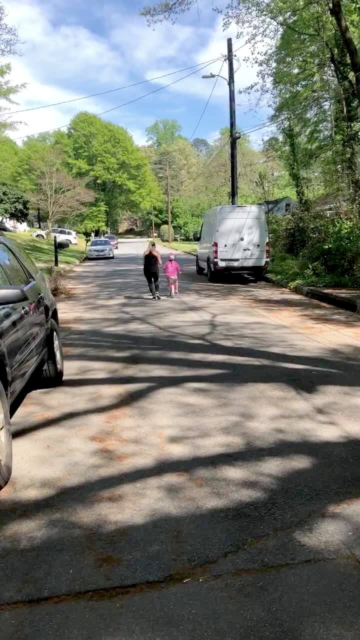 A woman holds onto a young girl as she rides her bicycle and lets go of her, and the tot girl screams "daddy, this is for you" and then crashes into a van.