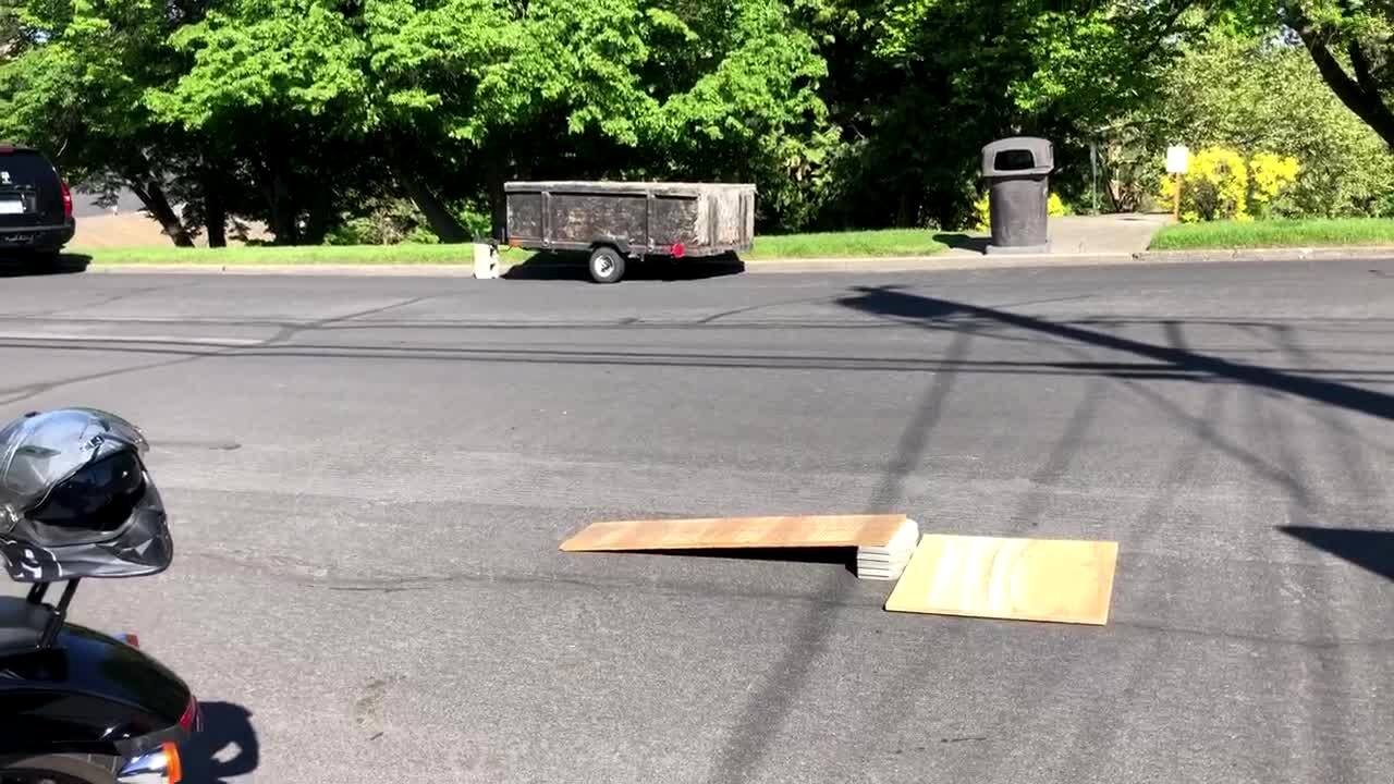 A young boy crashes his mini-motorcycle into a couple of pallets stacked on top of one another.
