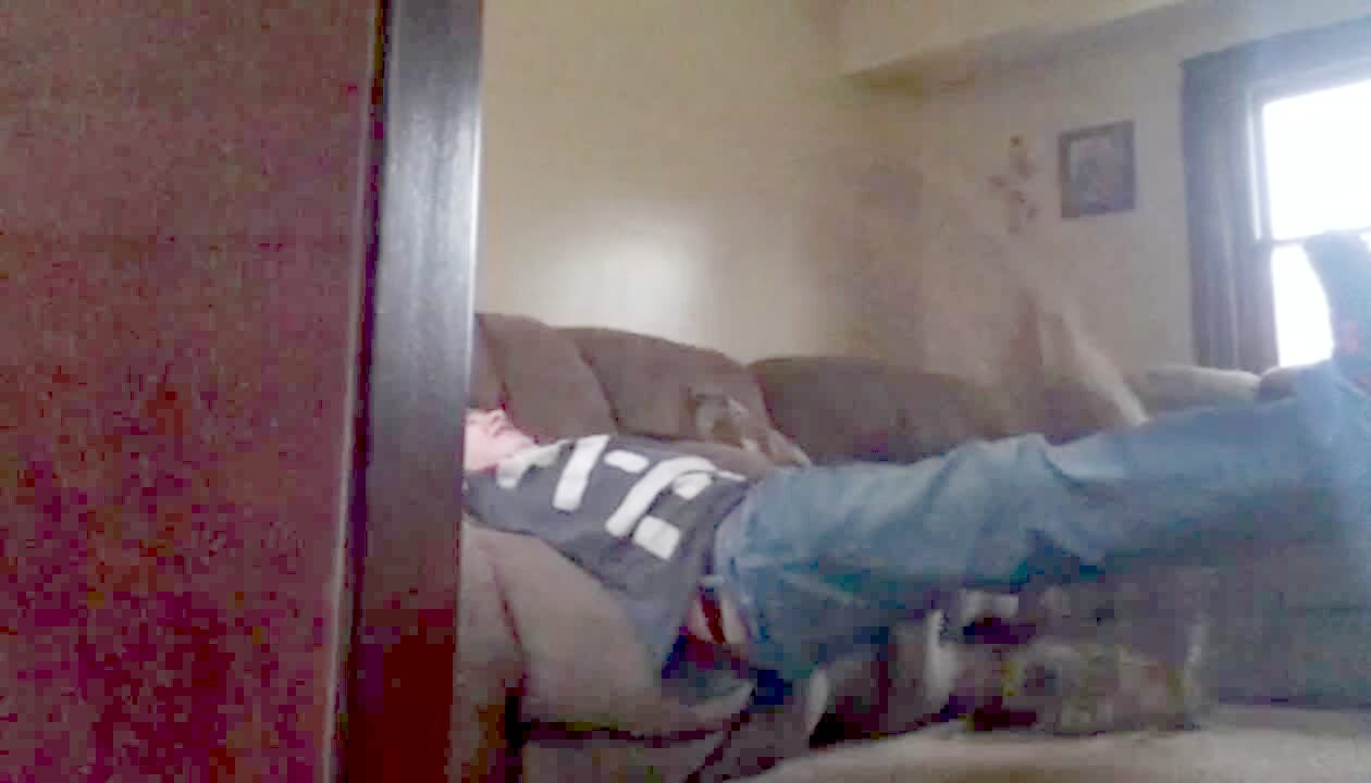 A dog repeatedly jumps over a boy on a couch until it lands on his groin.