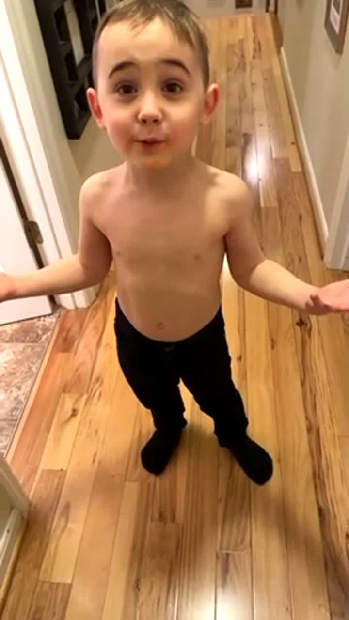 A young boy tells his mom "I got my first muscle but I didn't even workout", then he flexes his biceps in a hallway.