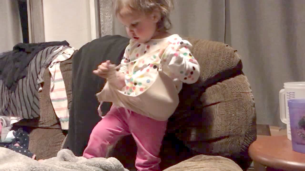 A tot girl fastens a bra around her waist as she says it's a life jacket, she sings a song about it, then her father says, "Isn't that a bra" and the girl repeats that it's a life jacket.
