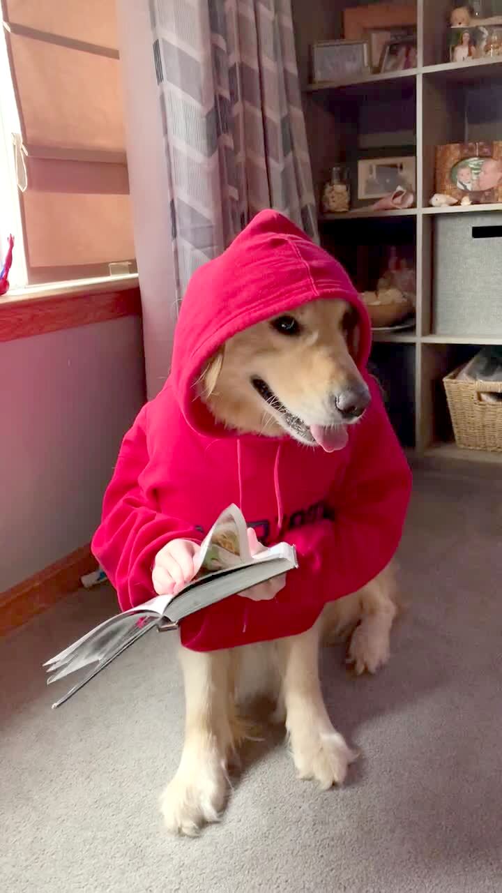 A dog with borrowed hands flips through a book in the living room, but looks away from it.