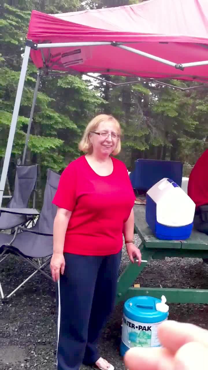 Man filming gets two women to pose for picture under picnic tent at campsite, other man dumps water from tent on women and soaks them. . Pranks.