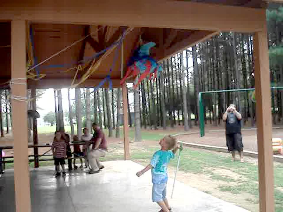 Tot boy swings at pinata. When the pinata swings back at him, he gets knocked over. Party.