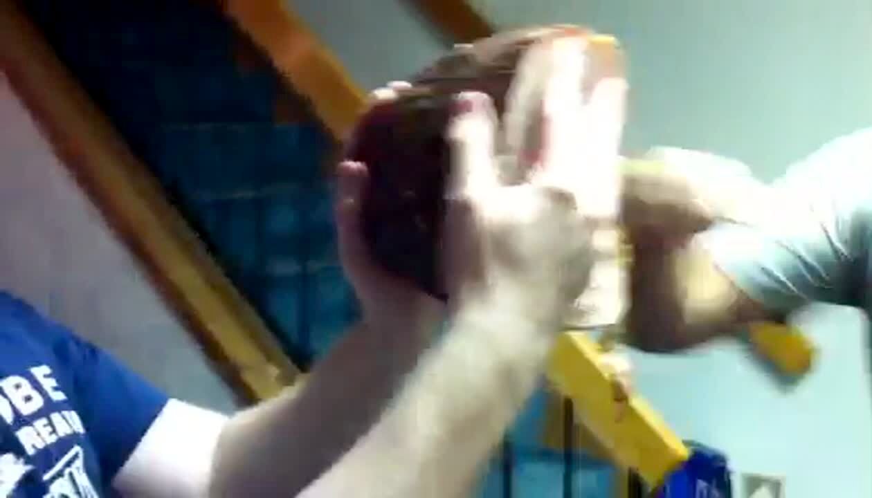 Man tries to punch a ham hock that friend is holding up in living room, ham flies and hits camera lens.