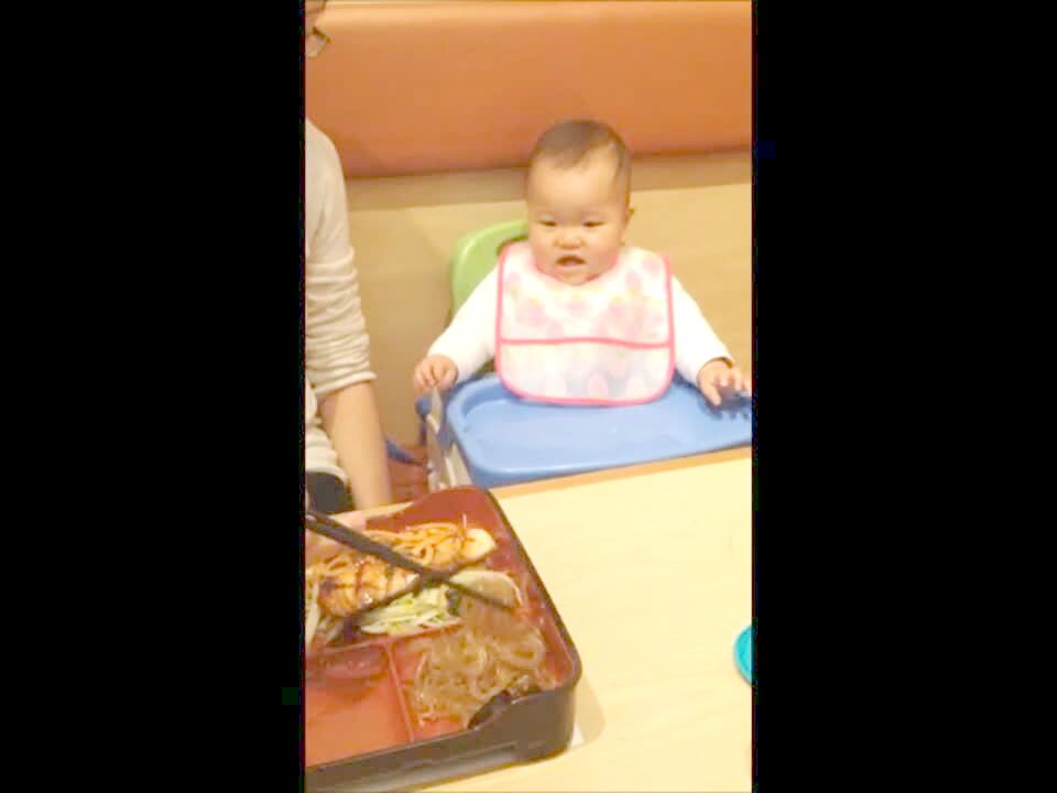 A baby girl smiles with food in her mouth, and then she sneezes and a long noodle comes out of her nose.