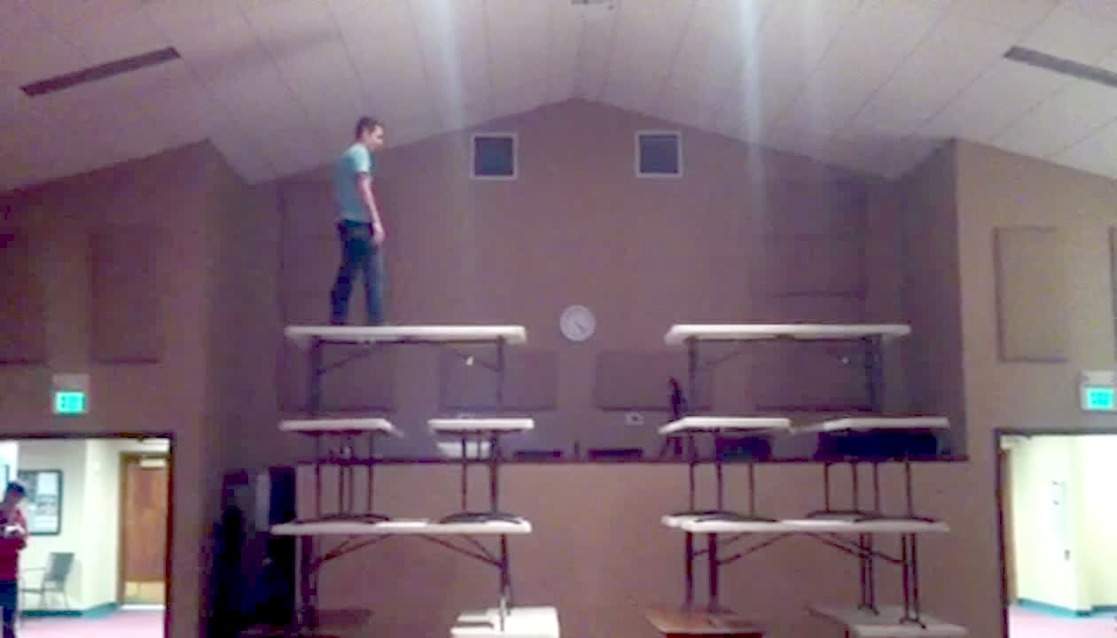 A man stands on a stack of tables. He jumps from one stack to another. The stack collapses and he falls.