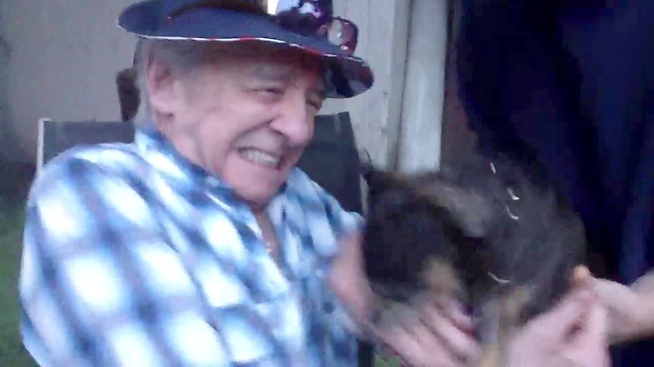 Senior man tries to hold a chihuahua. Chihuahua growls and snarls, then bites man's ear.