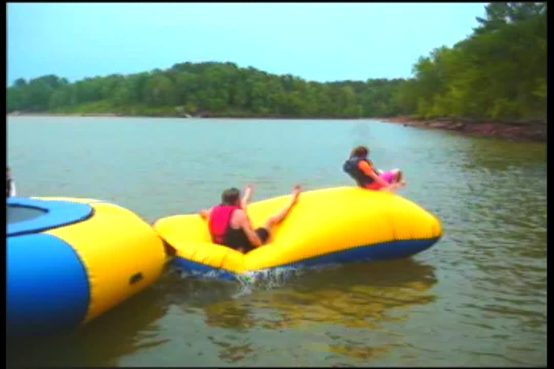 Man jumps on one end of an air mattress and pops a young girl up into the air. She lands in lake water. Girl does a back flip.