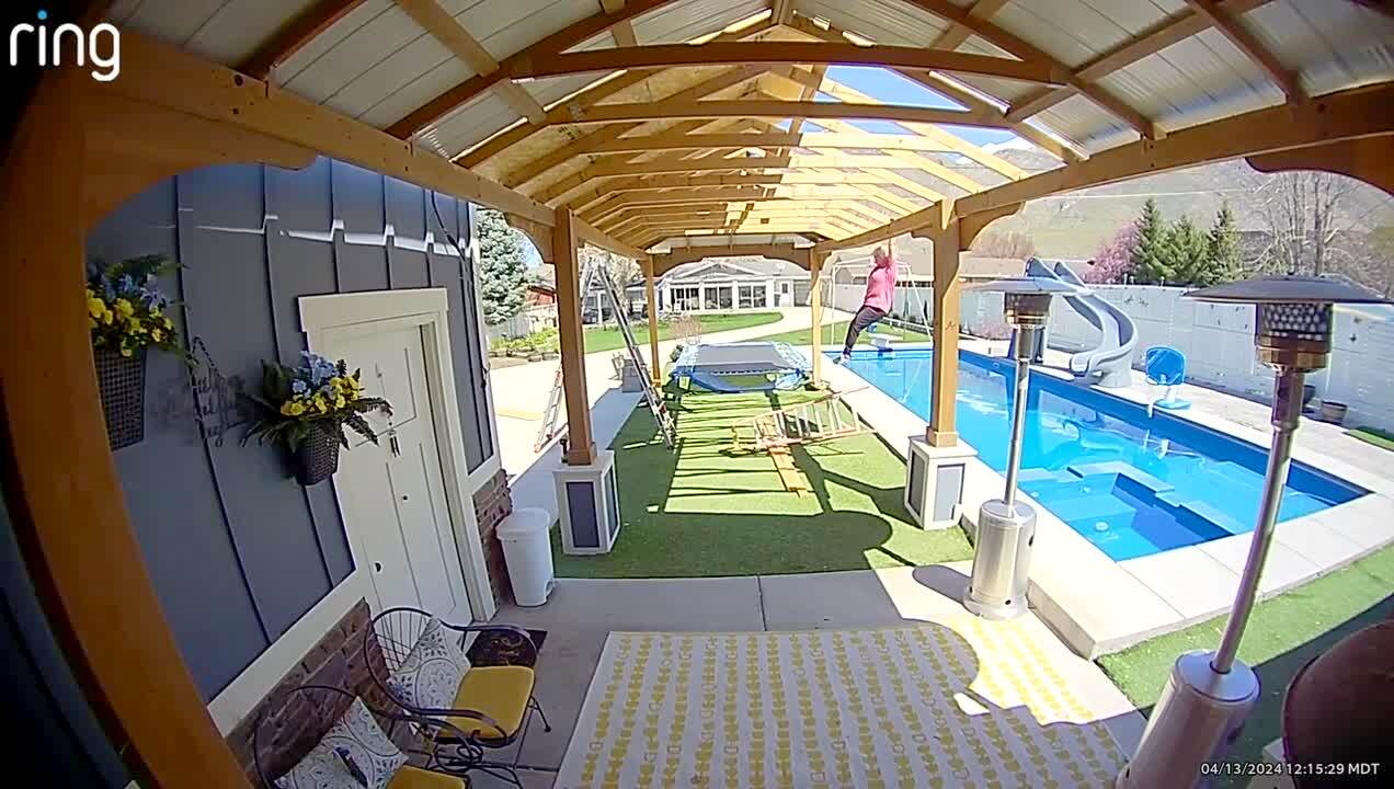 A woman sprays a wasp on a deck, but she avoids it and bumps into objects before she throws the can and runs away. Security footage.