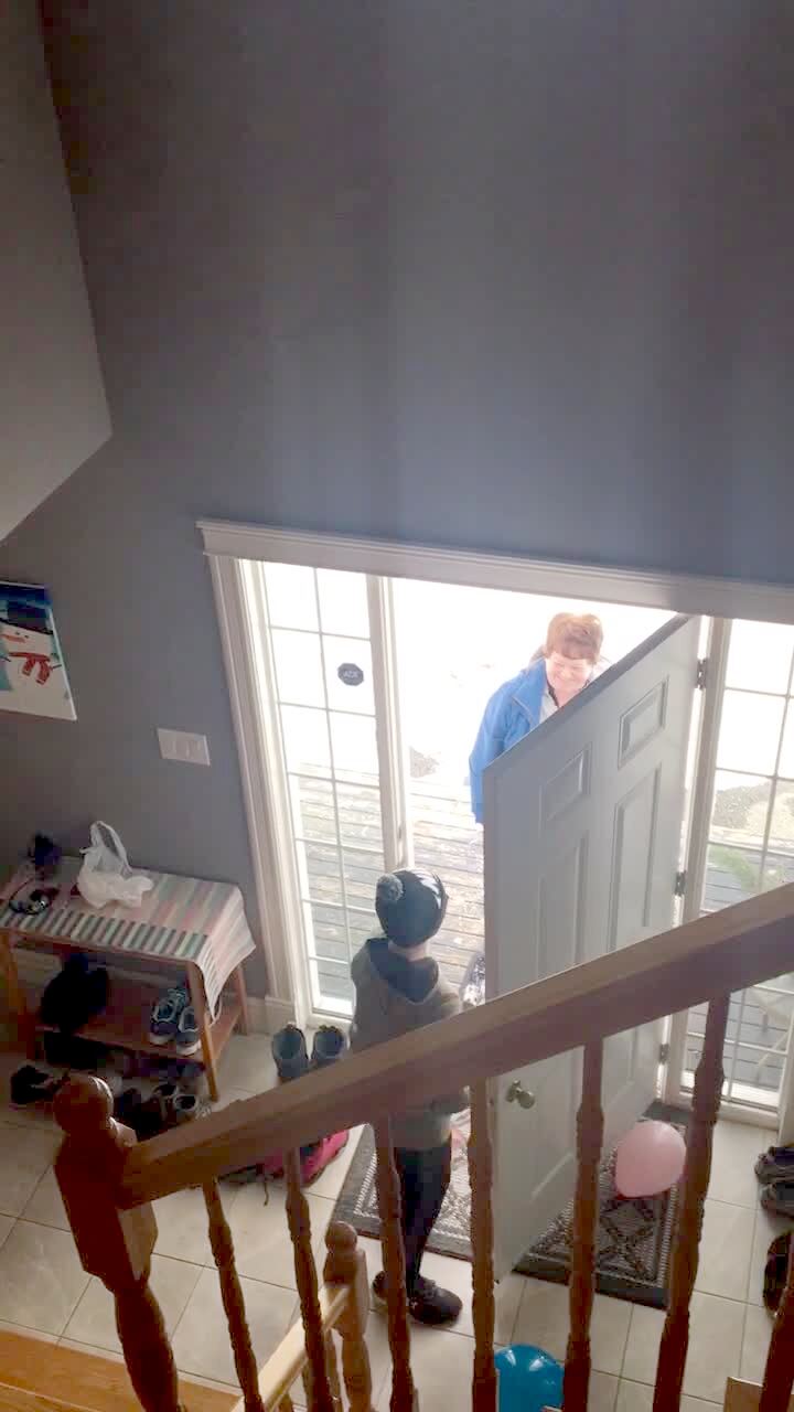 A woman records herself and says her kids have found something and she shows a spider in a bucket and the spider jumps and she and the kids scream.