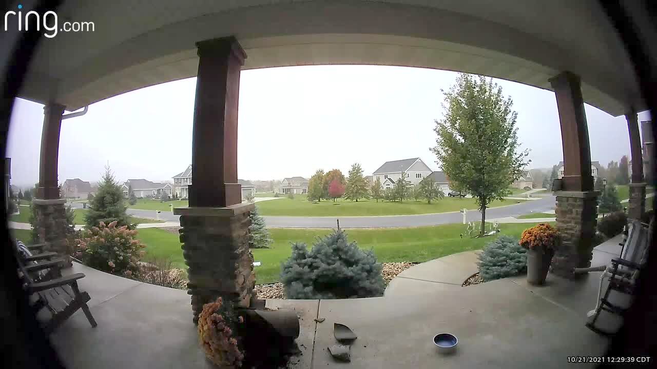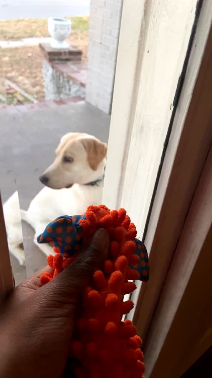 A woman in the house squeezes a dog toy. A dog on the front porch hears it and repeatedly rams into the window.