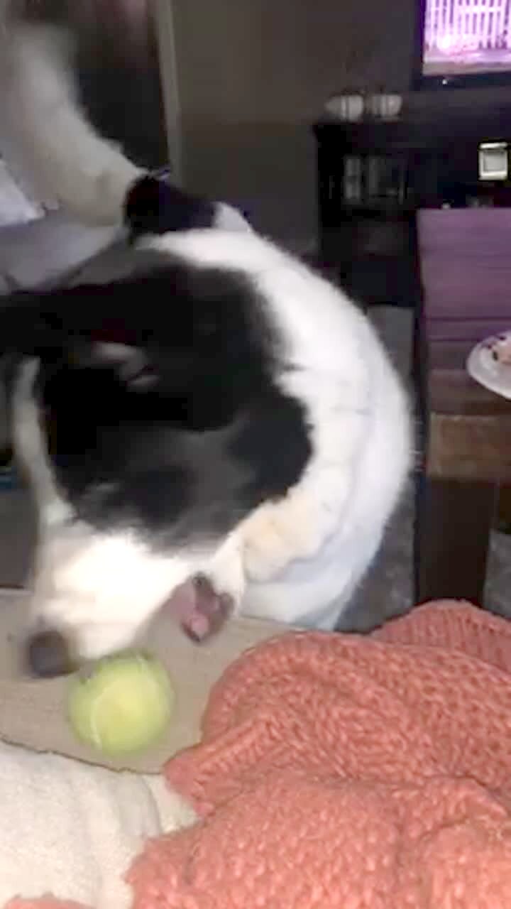 A Boston Terrier dog plays whack a mole, and falls off of a chair at the kitchen table.