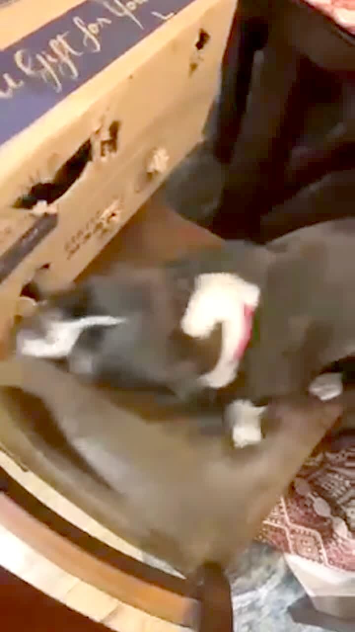 A woman opens the front door and a dog attacks and barks at a FedEx box and grabs it.