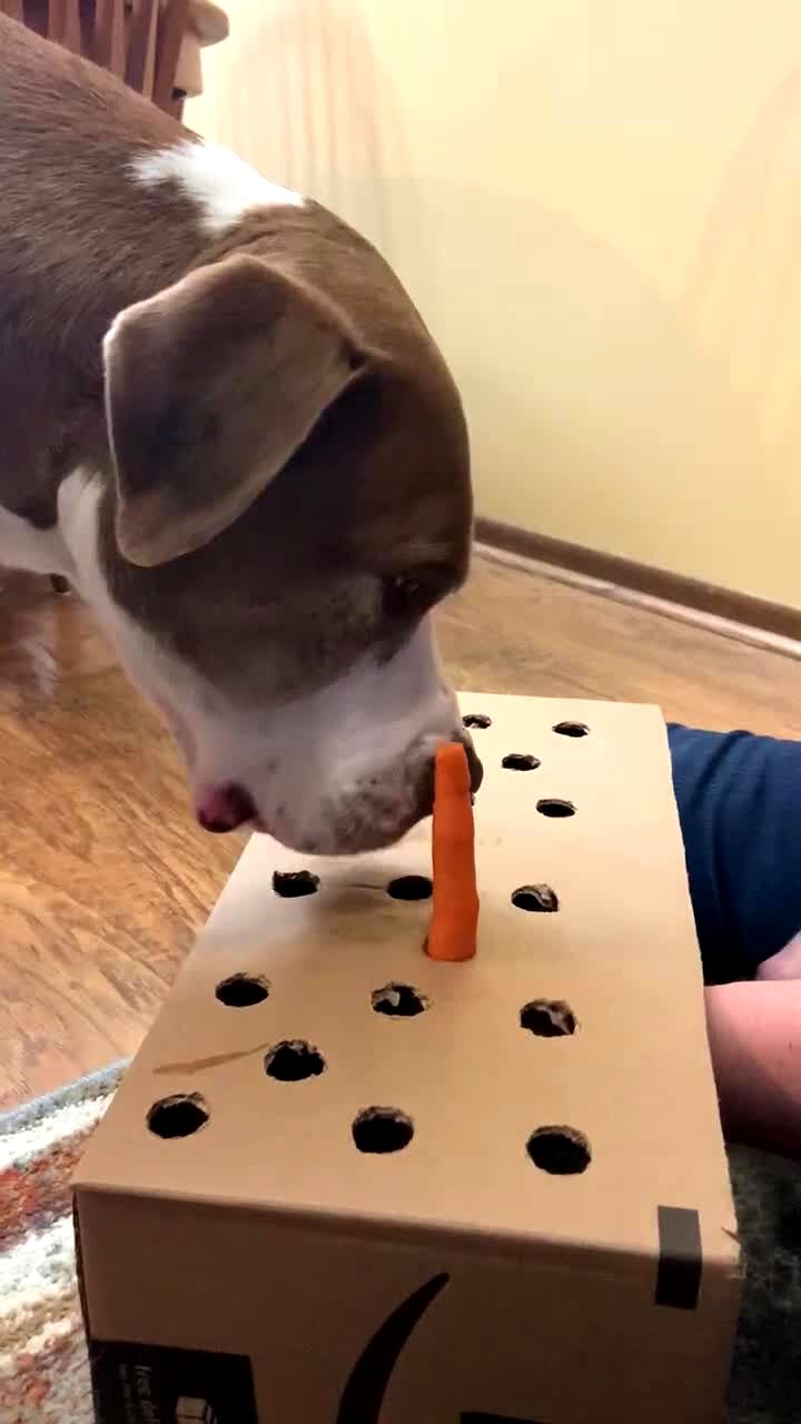 A dog bites at a carrot as it goes through holes in a box. The dog then bites at the carrot and walks away with the carrot and the whole box.