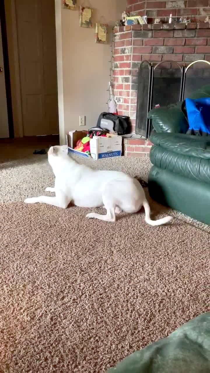 A small dog jumps on a larger dog in a living room and the larger dog kicks and launches the smaller dog into the air.