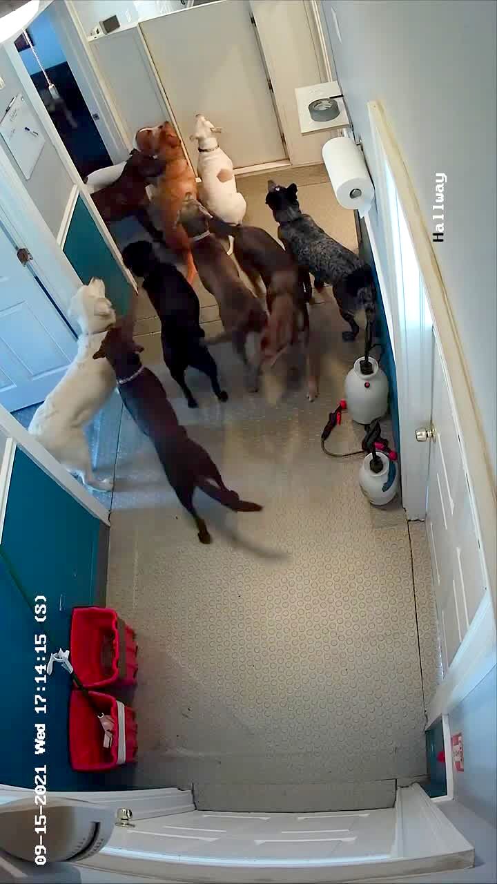 "Escape from Bark-atraz" A Pit Bull dog jumps up on a door at a dog daycare and swings it open for a group of dogs to run out of the room. Security footage.