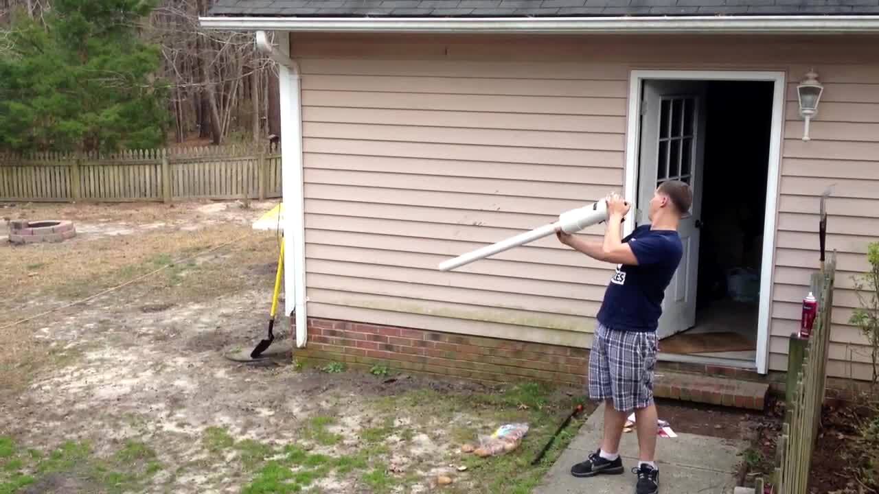 A man shoots a potato gun outdoors and it kicks back into his face. Bonehead.