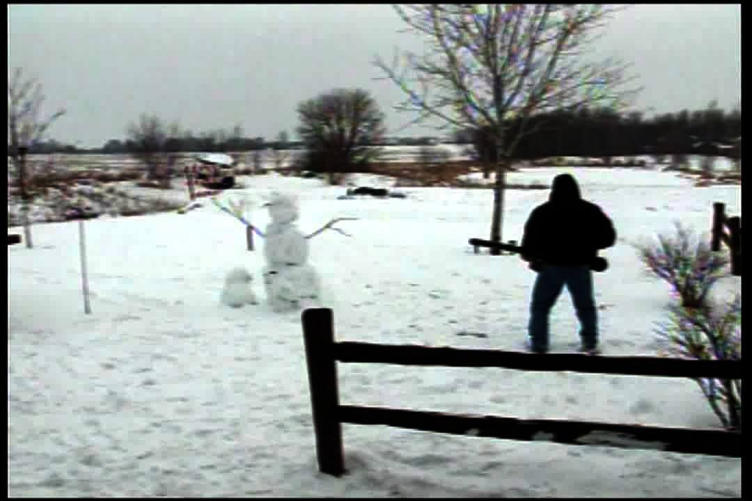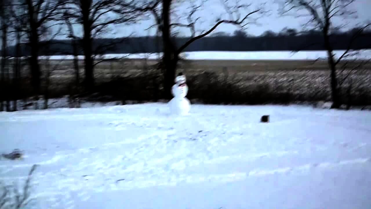 Man shoots a snowman with a potato gun, the snowman's head explodes.