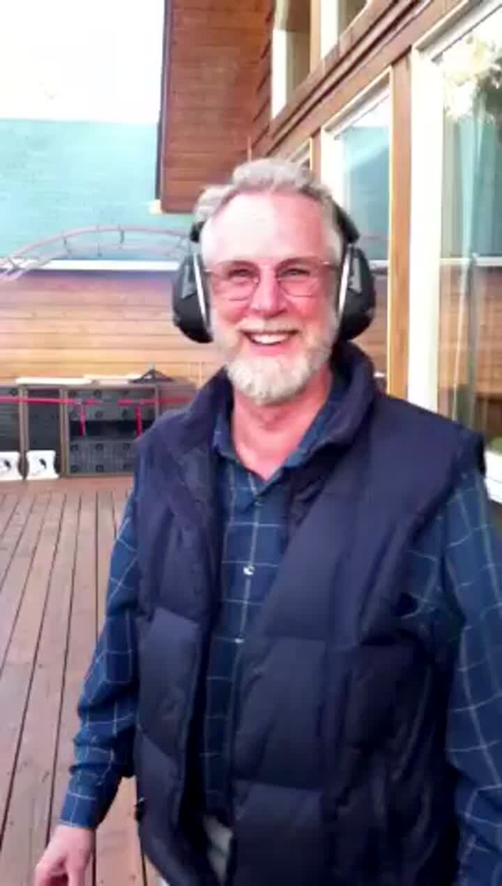 A senior man shoots a potato gun outdoors and the gun makes a funny plunking noise as the potato doesn't go very far.