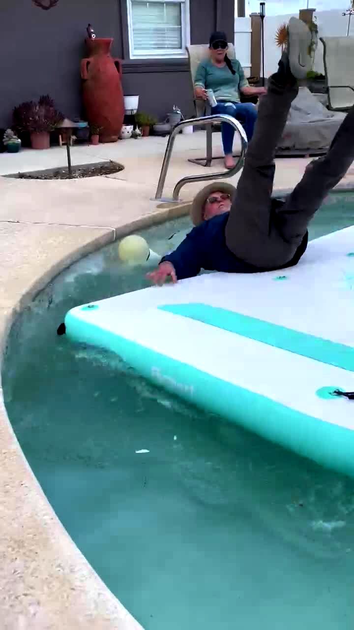 A senior man stands on an inflatable deck in a swimming pool and as he tries to push the raft away from the shallow end he looses his balance and falls into the water.