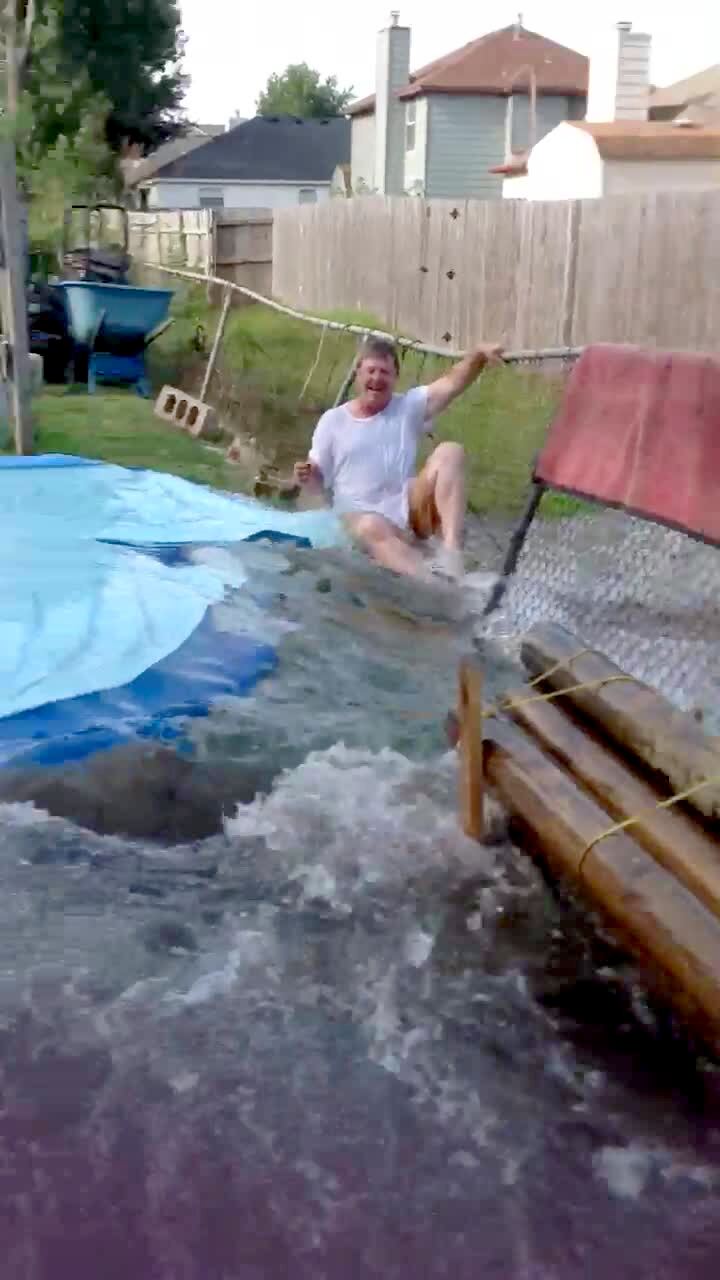 A man slices holes into an above ground pool and on the third slice, the pool bursts open and the water flow knocks the man down and floods his back yard.