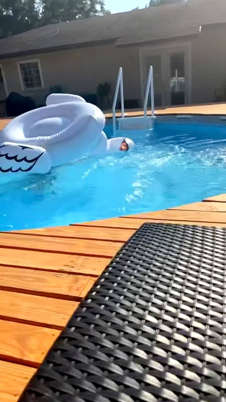 A woman tries to get on a swan float in a pool. She falls off into the water.