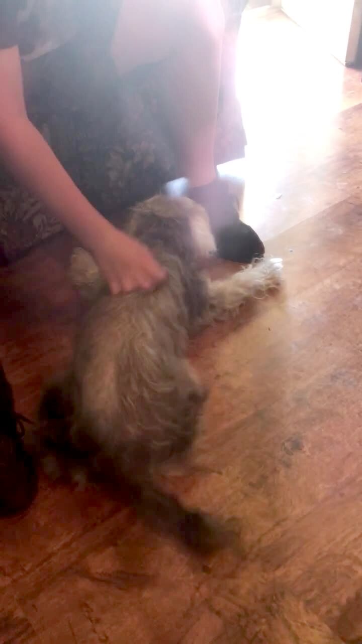 Woman sits on the living room floor & pets a small dog in her lap. The dog shakes its paws very quickly when woman rubs its ears.