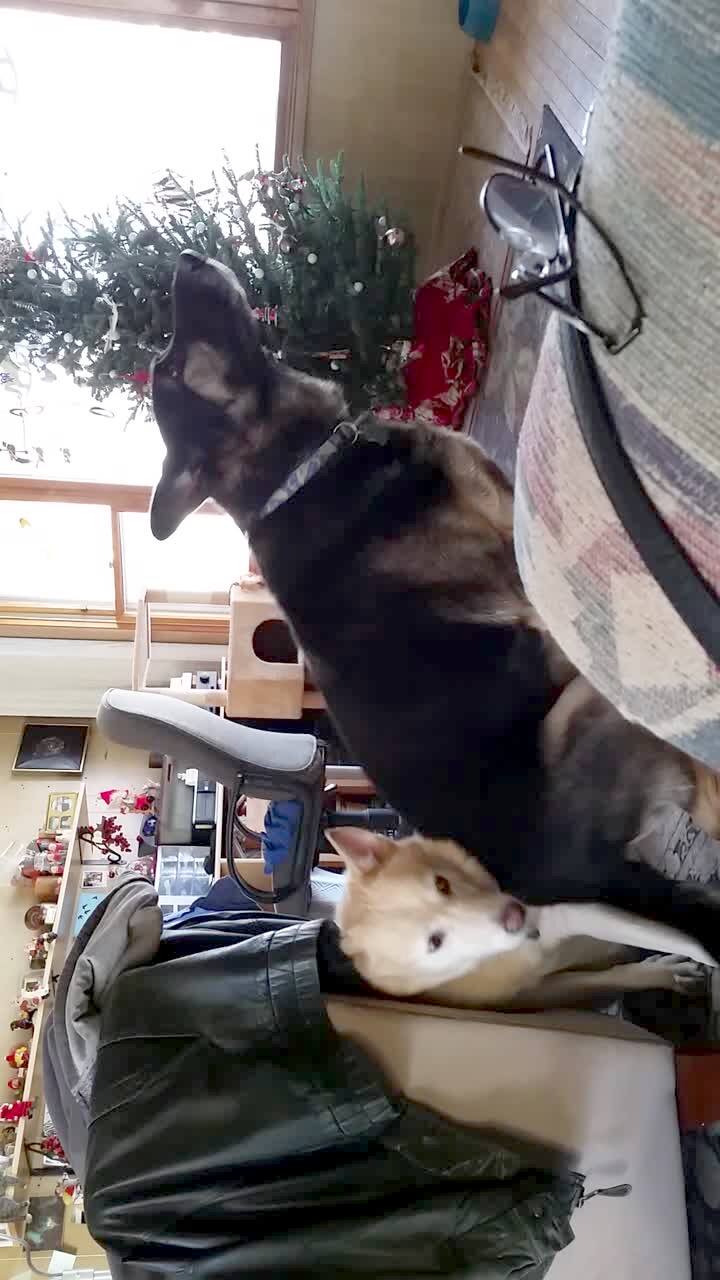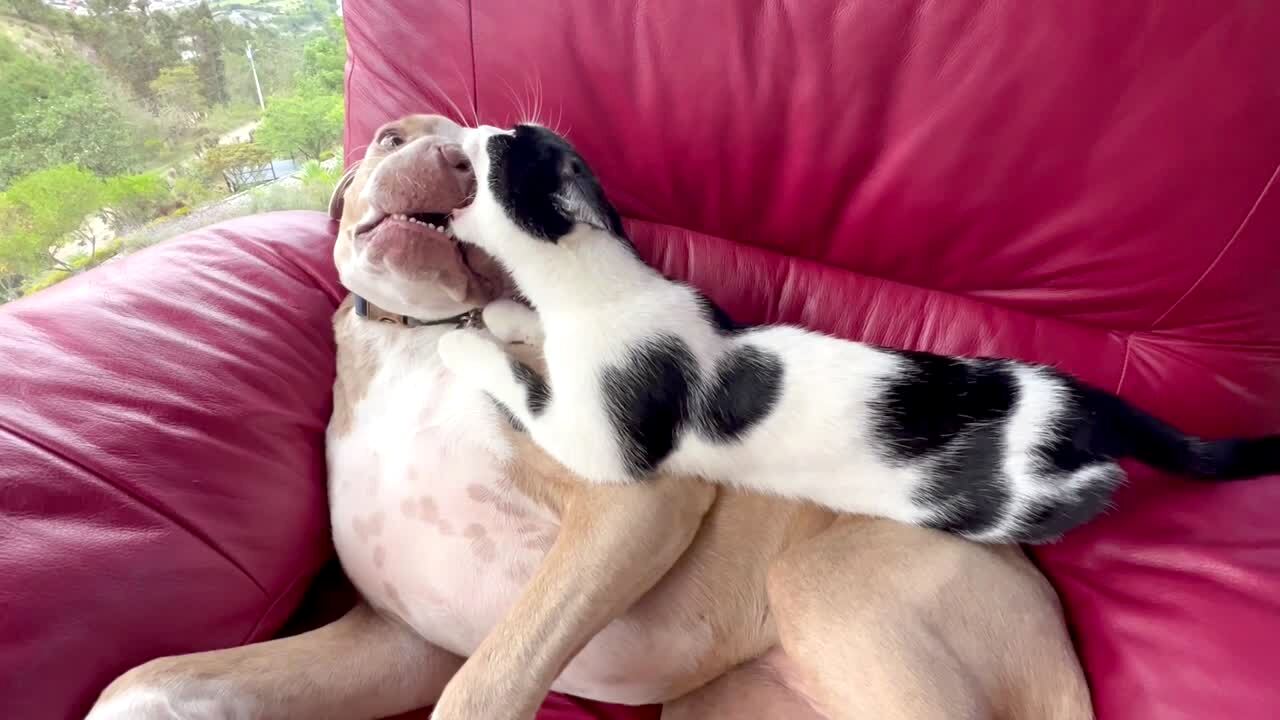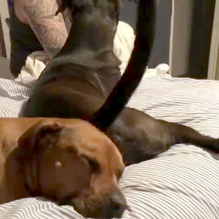 A dog wags her tail repeatedly right on the face of another dog who just lies there and takes it.