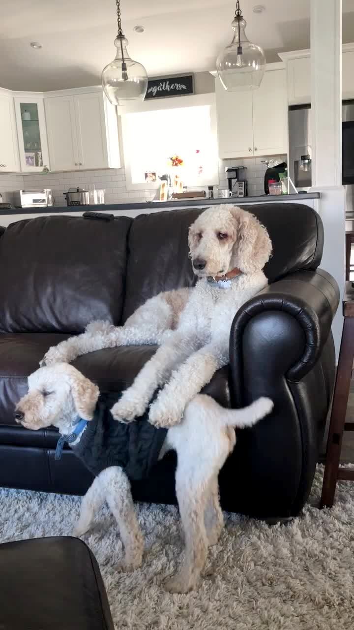 A dog lays on a couch with his paws hanging off and another dog uses the first dog's paws to scratch his back.