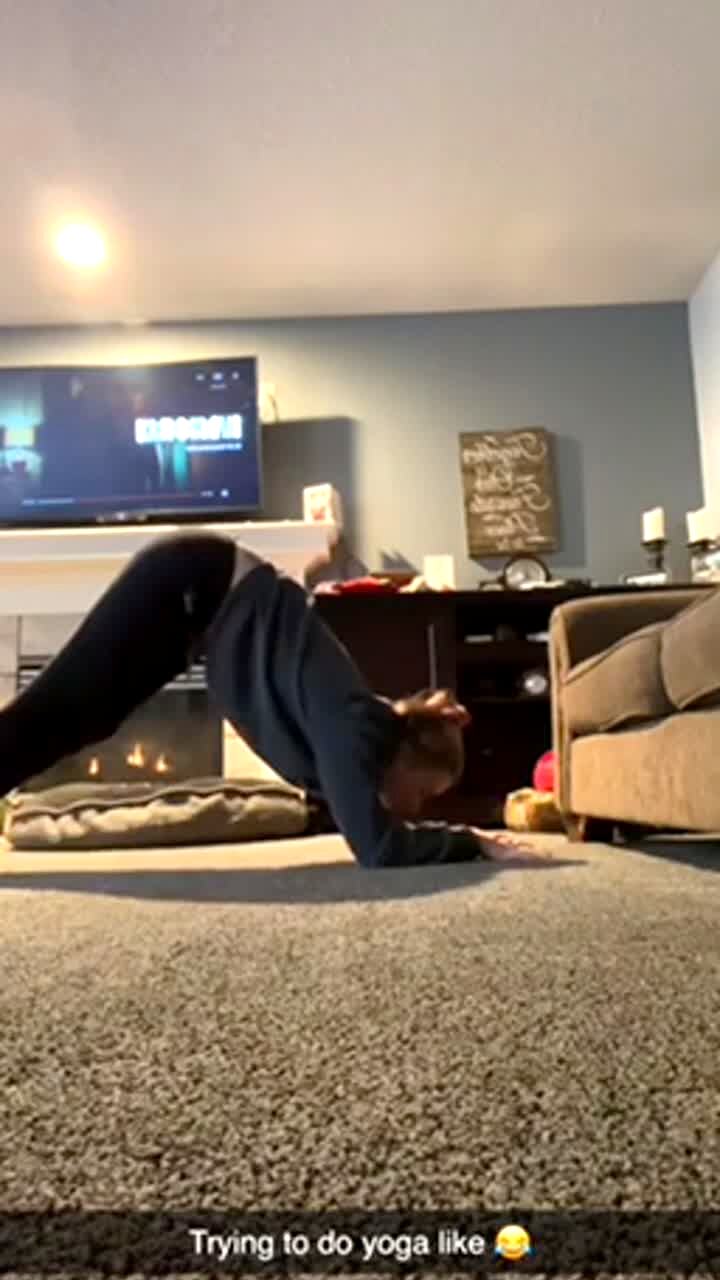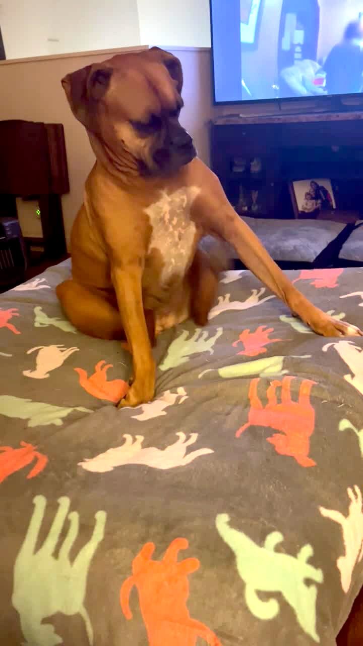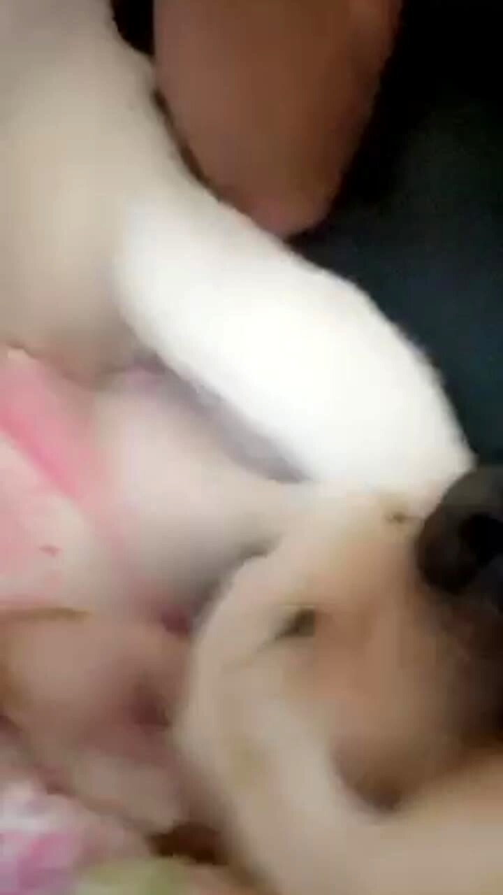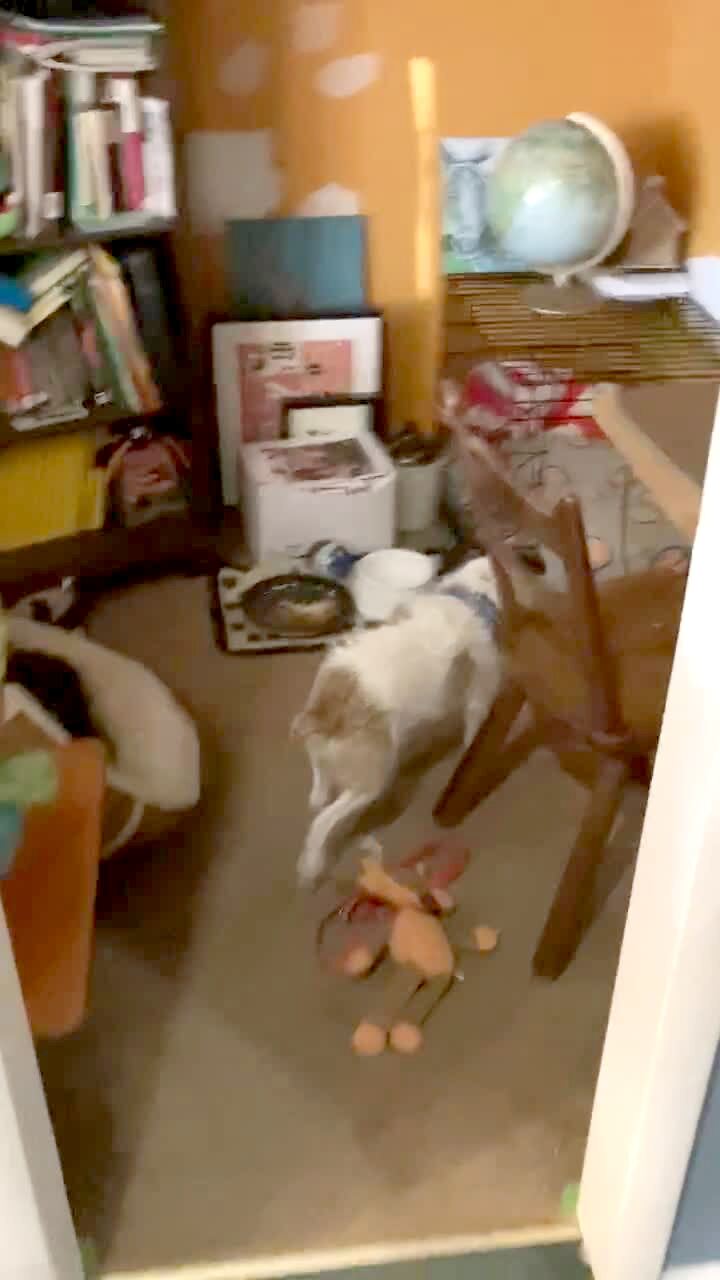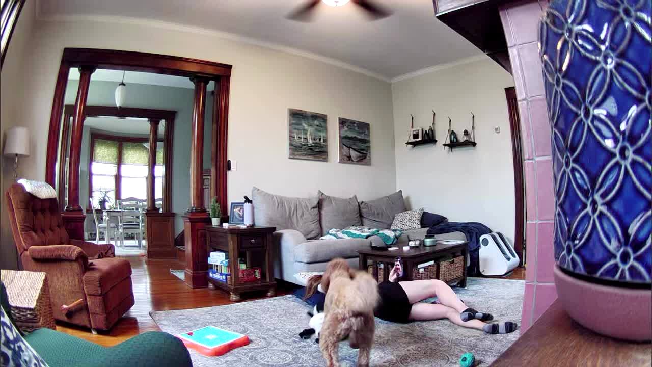 A dog hits a woman with a stuffed toy repeatedly and barks at her while she is lying on the floor using her phone. Security footage.