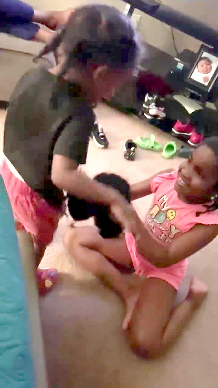 A tot boy passes a woman's wig to his older sister and calls it a puppy.