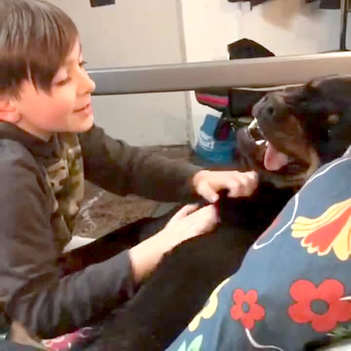 A dog makes a funny growling noise with her tongue sticking out as she is pat by a young boy.