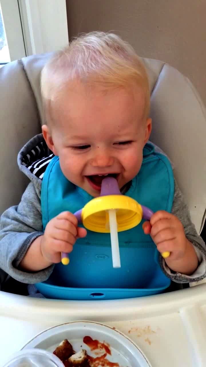 A baby boy grunts while he watches a woman roll a toy tractor in a living room, then he farts and falls over backward.